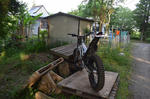 キャンパ・ヴァンのタイヤに前輪を当ててキックする。